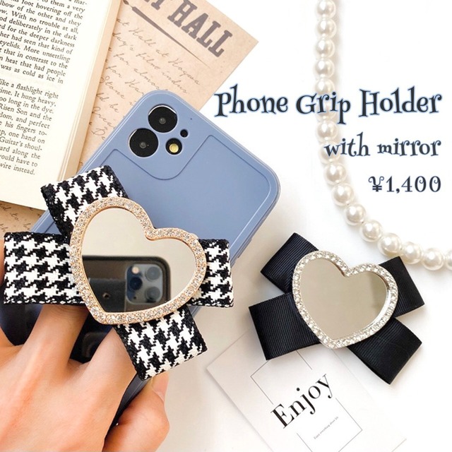 スマホグリップ ミラー ビジュー リボン 千鳥格子 折り畳み